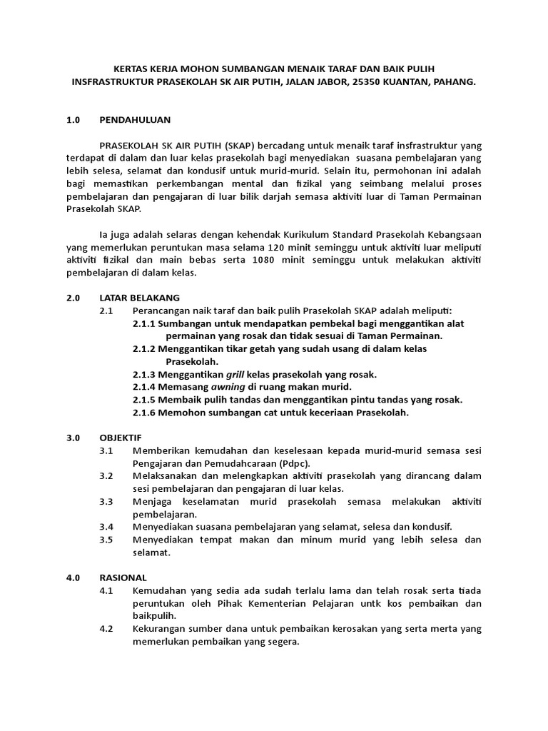 Kertas Kerja Mohon Sumbangan Menaik Taraf Infrastruktur Prasekolah Sk Air Putih Pdf